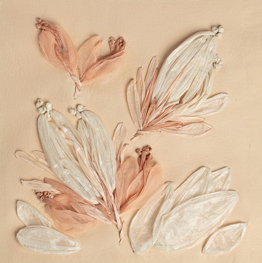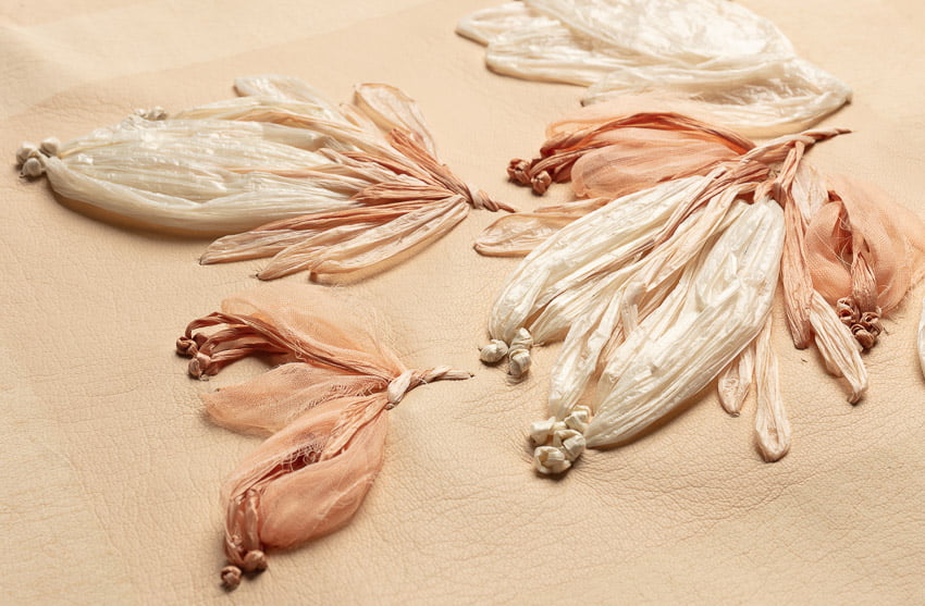 shown in raffia & organza on lambskin background – bespoke finishes & sizes available