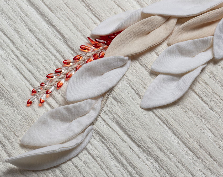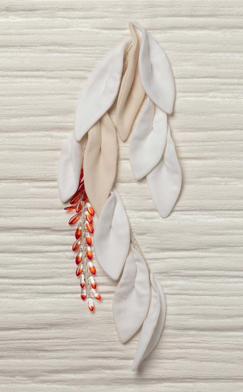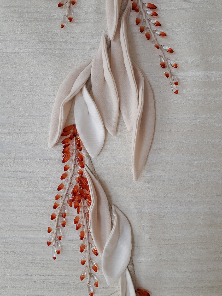 shown in handpainted glass dagger beads, wool & cotton leaves, raffia thread on textured fabric background – bespoke finishes & sizes available