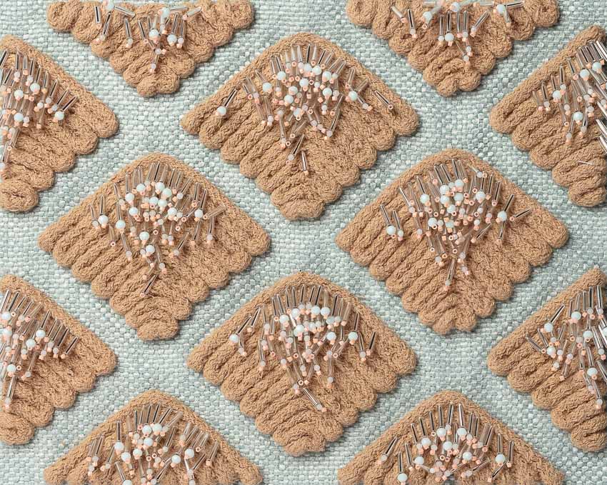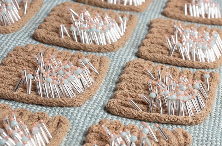 shown in braided cotton, bugle & round glass beads on woven cotton background – bespoke finishes & sizes available