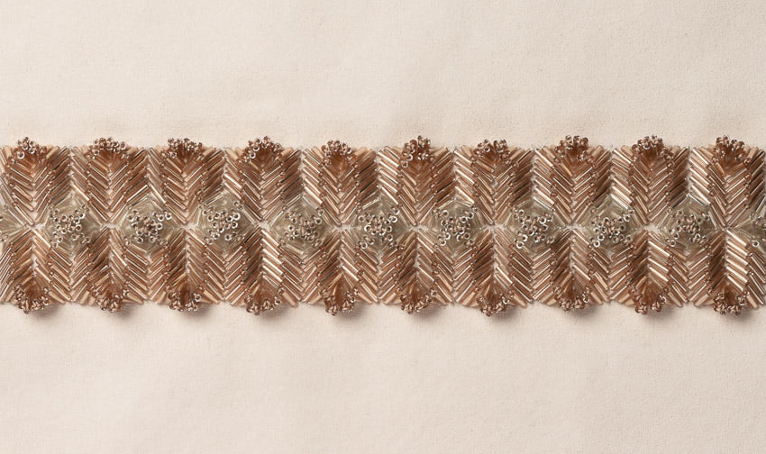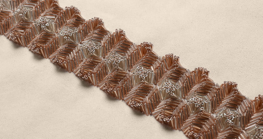 shown in tube beads & thread on cotton satin background – bespoke finishes & sizes available