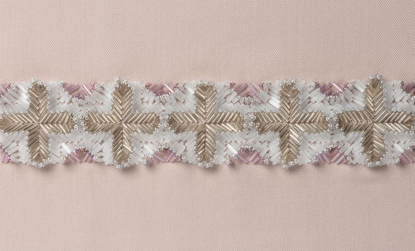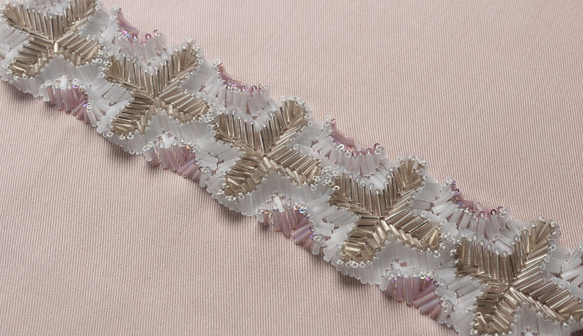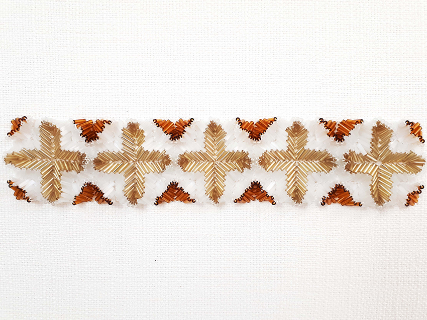 shown in tube beads & thread on cotton satin background – bespoke finishes & sizes available