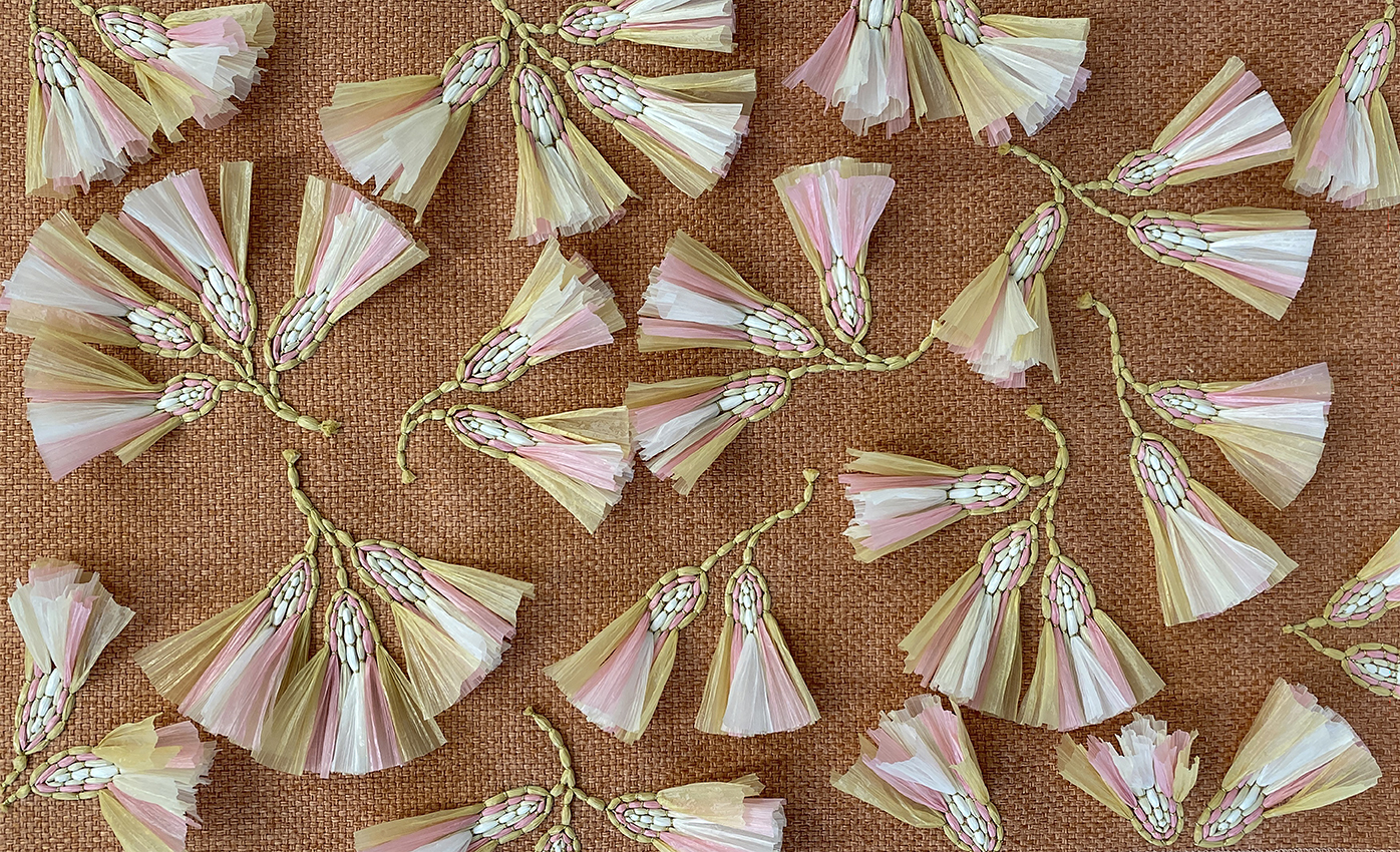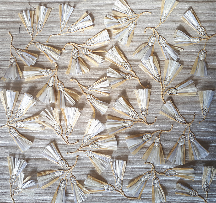 shown in raffia & lurex thread on fabric background – bespoke finishes & sizes available