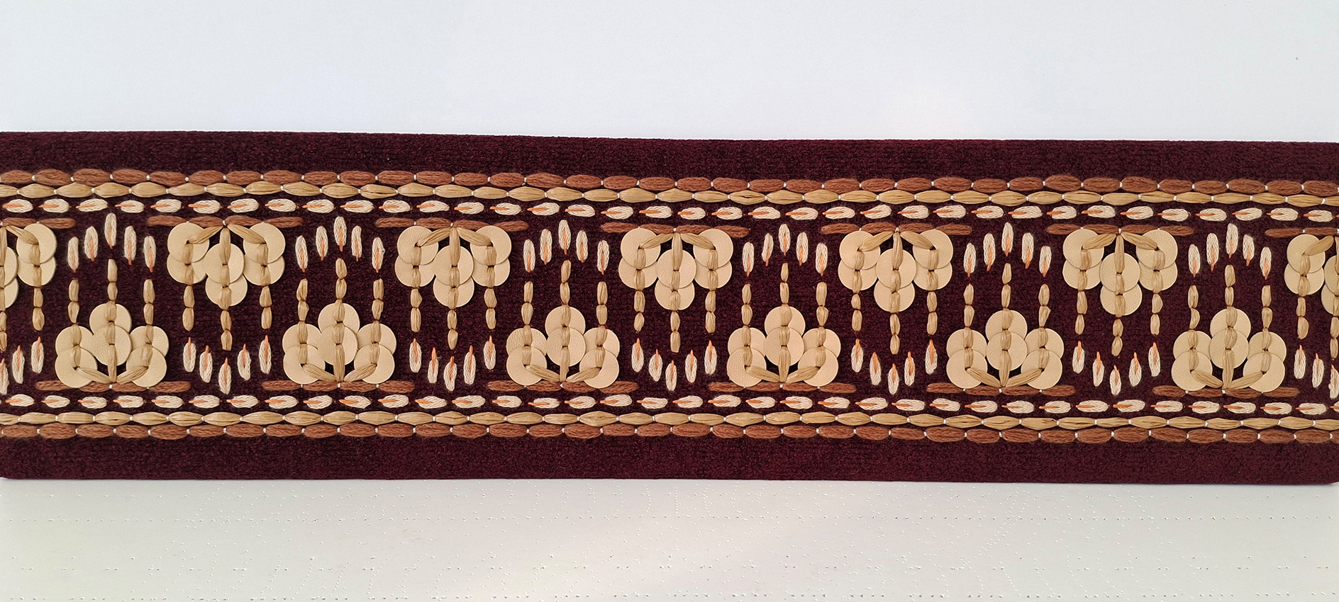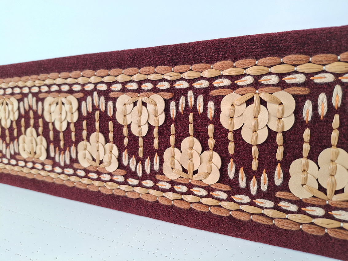 shown in wool, raffia, cotton ribbon, lurex, silk & lambskin leather sequins on fabric background – bespoke finishes & sizes available