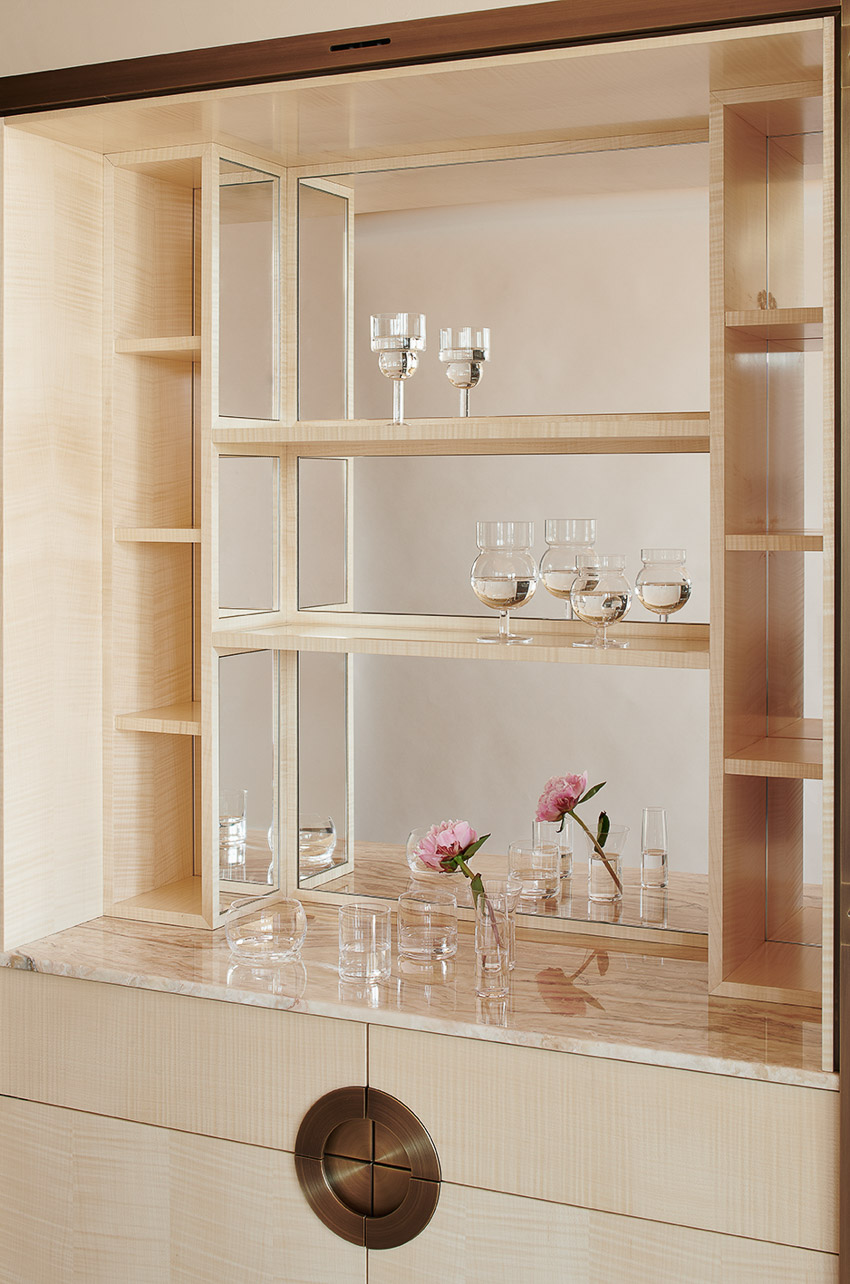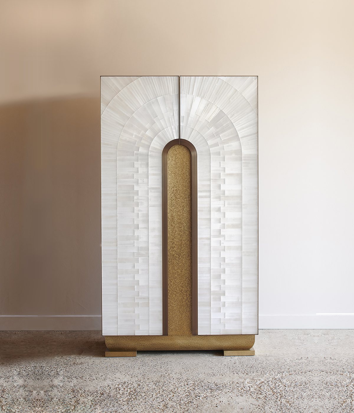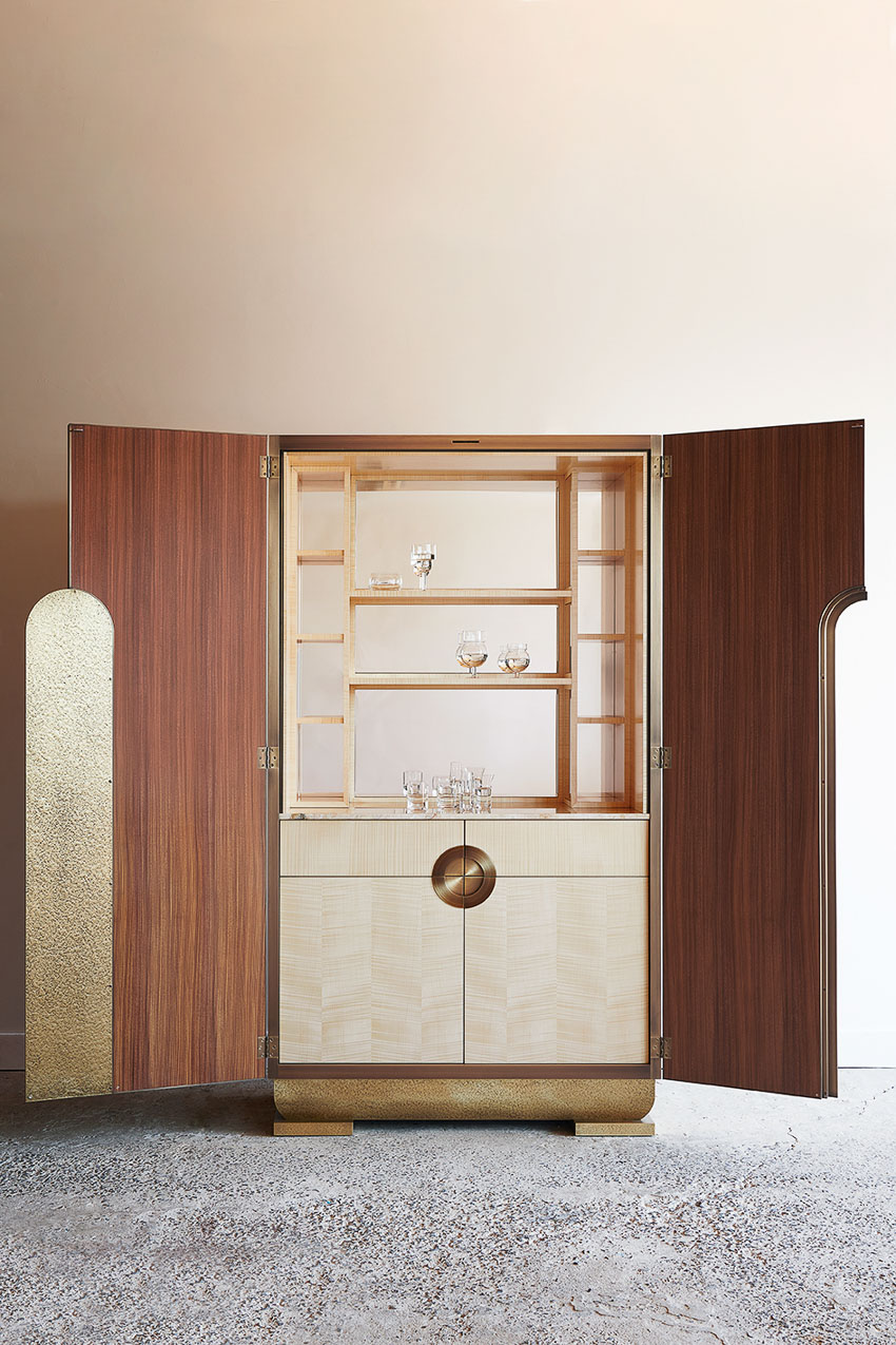 shown in gaïac, gypse, brass, onyx travertine, mirror, rippled sycamore – bespoke finishes & sizes available