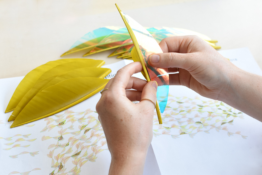 shown in turkey & goose feathers, steel, dichroic plastic – bespoke finishes & sizes available