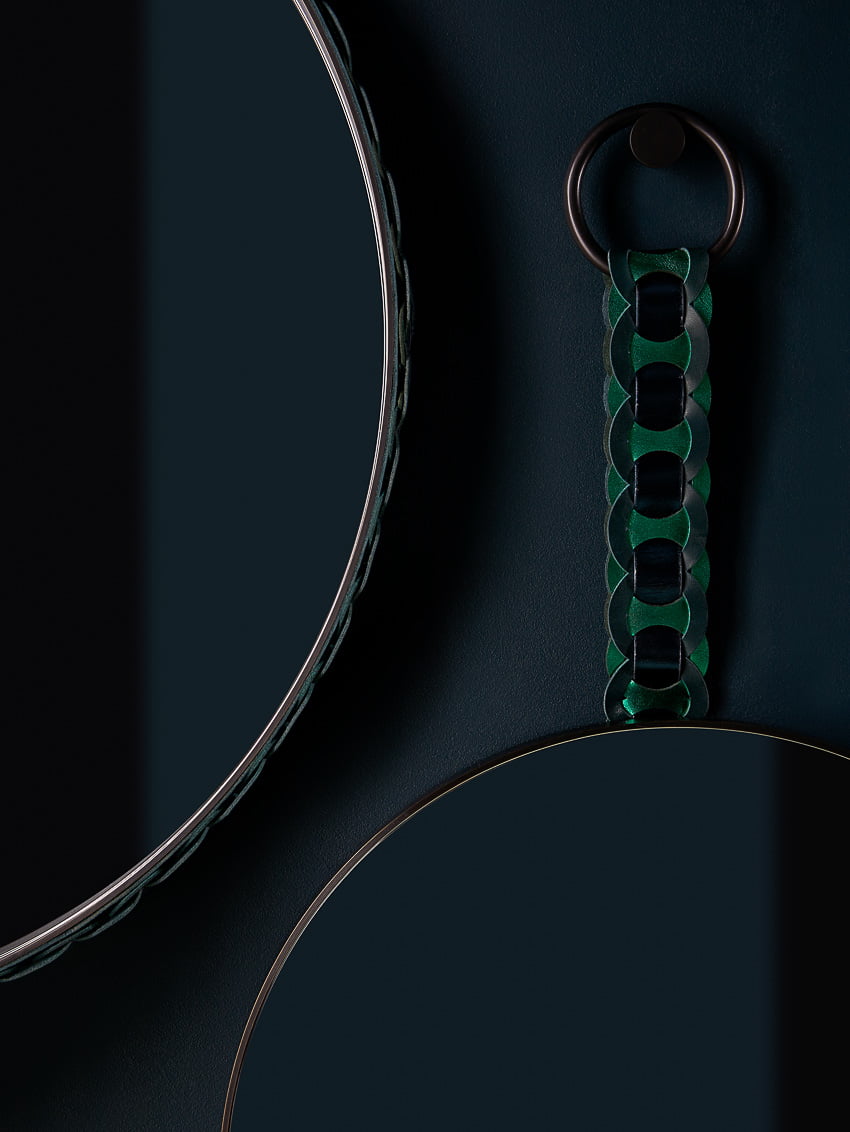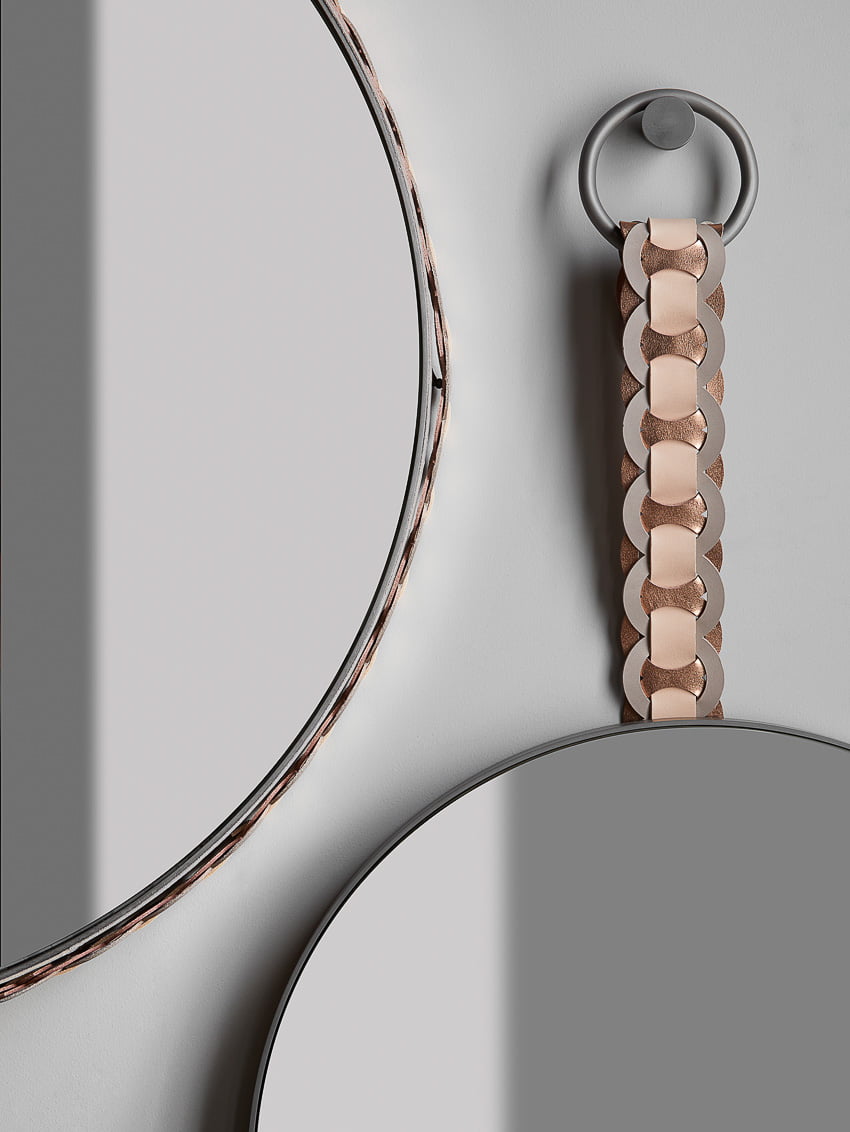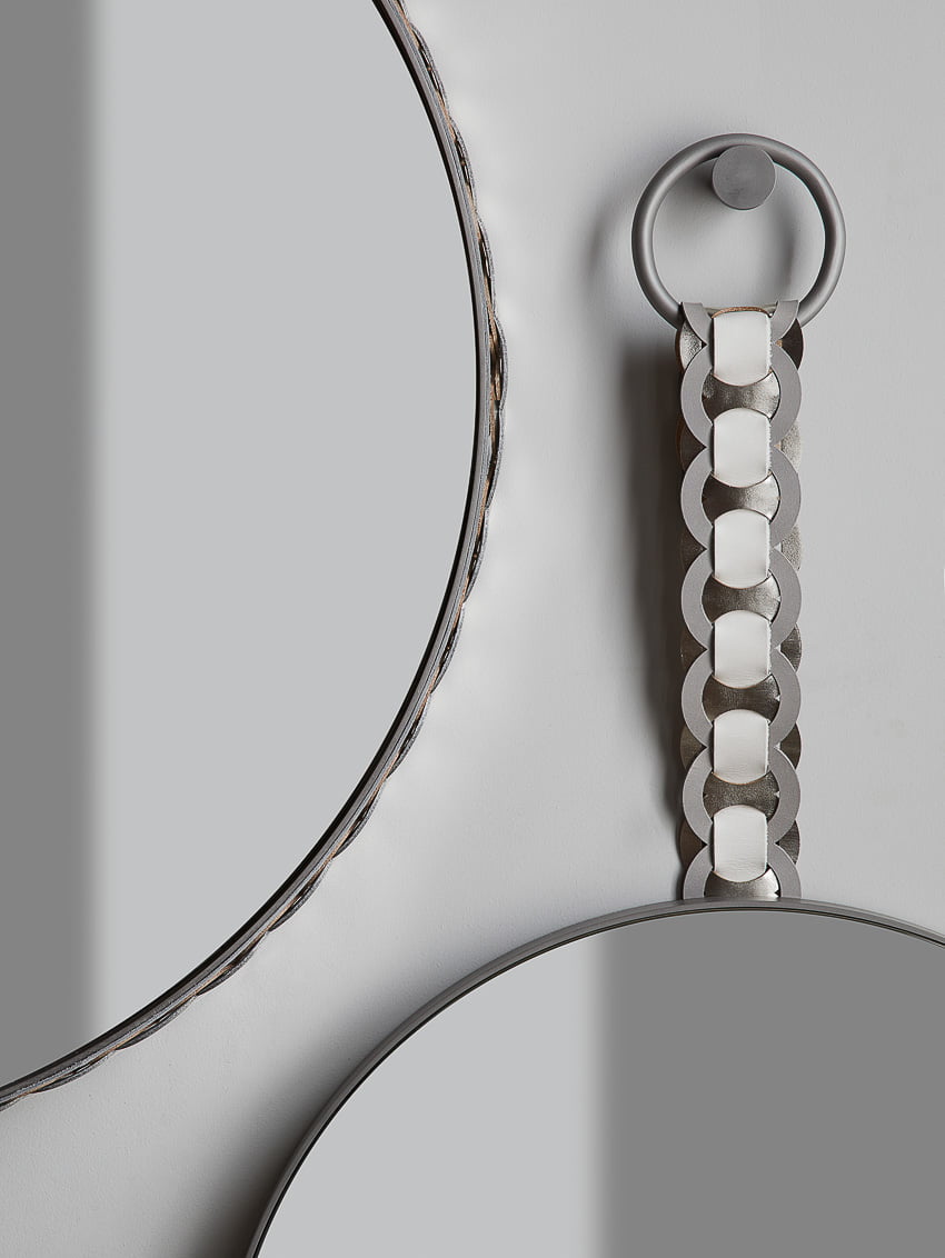 shown in handwoven Dove, Platinum & Cream vegetable tanned leather, pewtered steel frame – bespoke finishes & sizes available