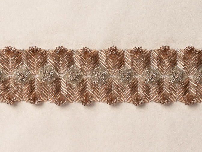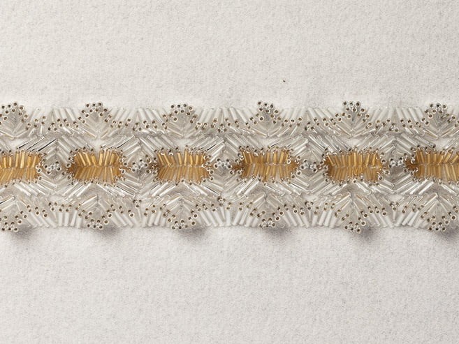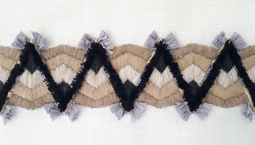 shown in wool, cotton thread, raffia, golden cannetille on fabric background – bespoke finishes & sizes available