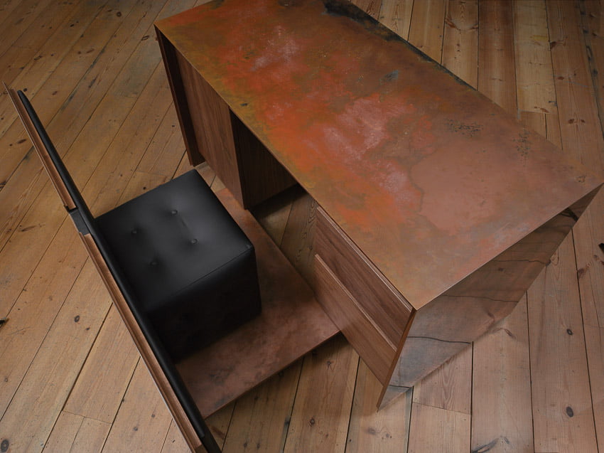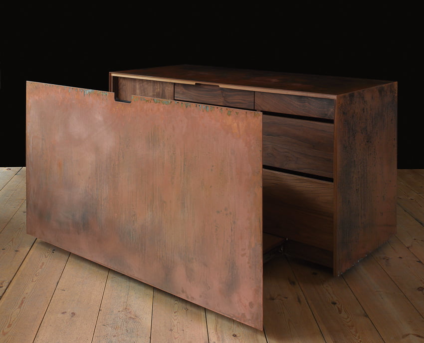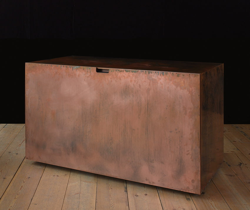 shown in copper sheet, walnut & leather – bespoke finishes & sizes available