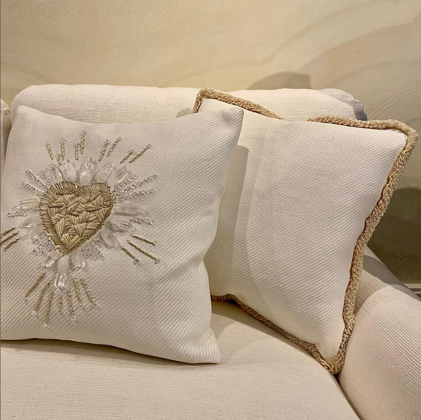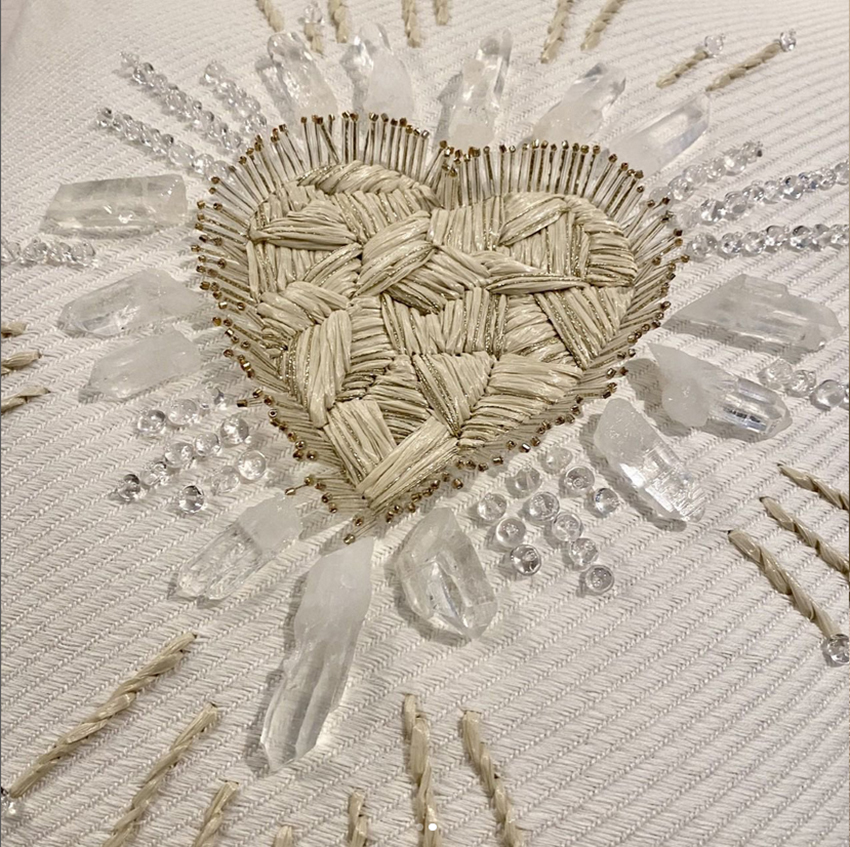 shown in raffia, rock crystal, glass bugle beads, metal thread on fabric background – bespoke finishes & sizes available