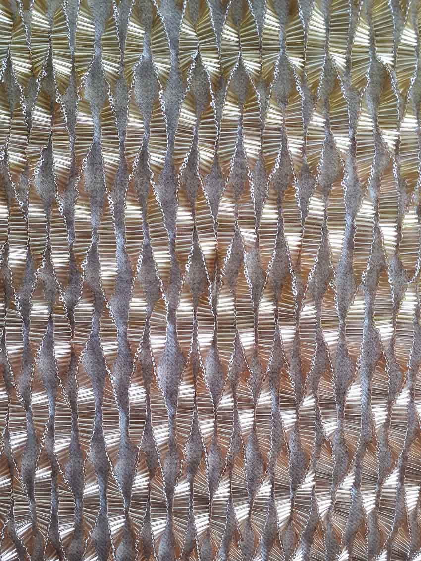 shown in glass bugle beads & metallic lurex thread on wool flannel background – bespoke finishes & sizes available