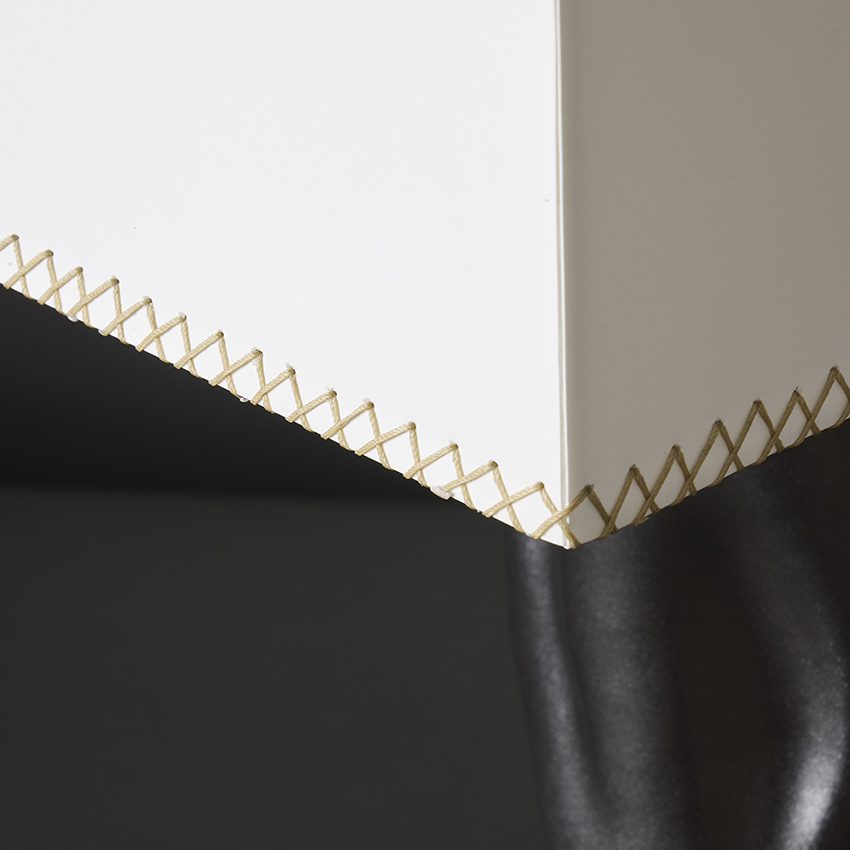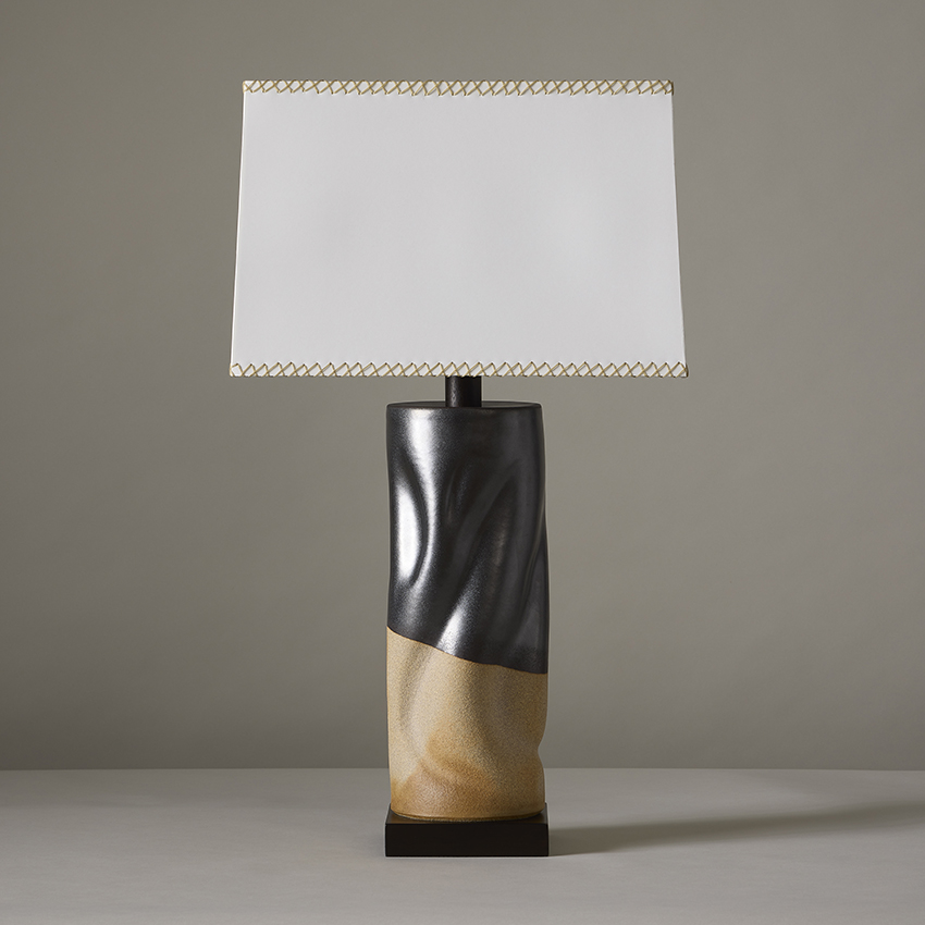 shown in white clay body with matte black glaze, dark stained walnut base, custom handstitched pattern paper shade – bespoke finishes & sizes available
