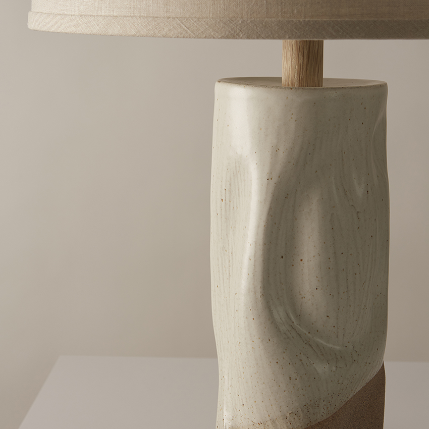 shown in white clay body with matte white glaze, bleached oak base, Sand linen shade – bespoke finishes & sizes available