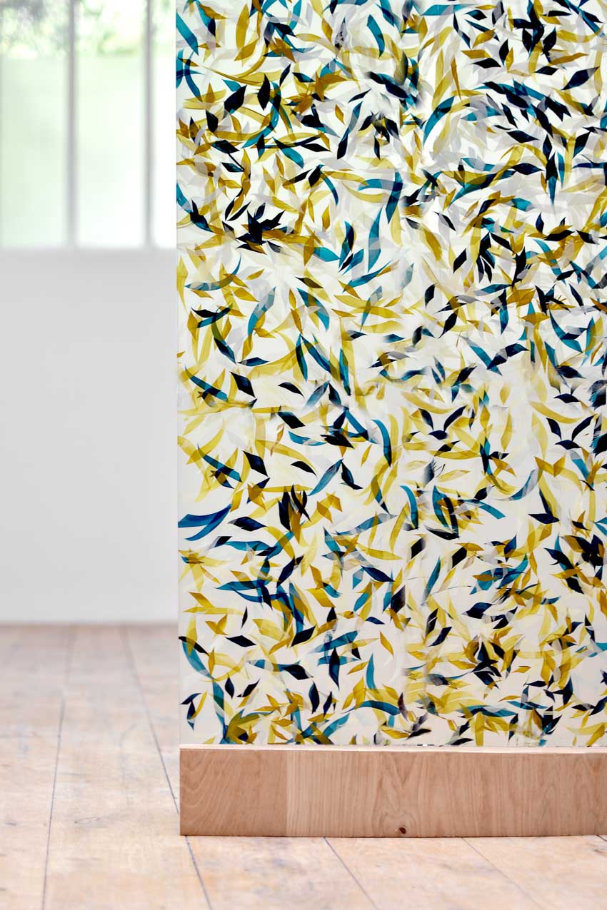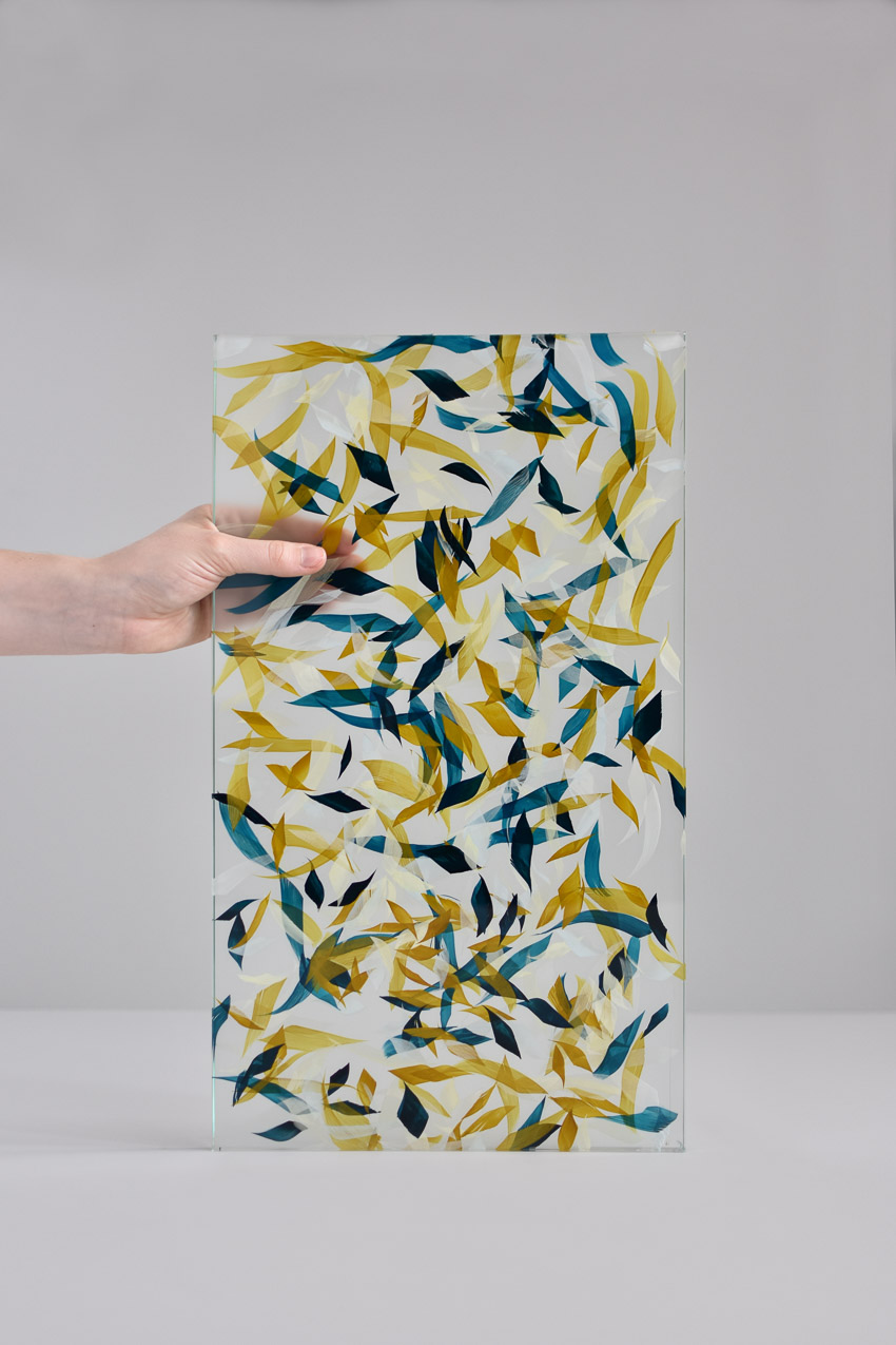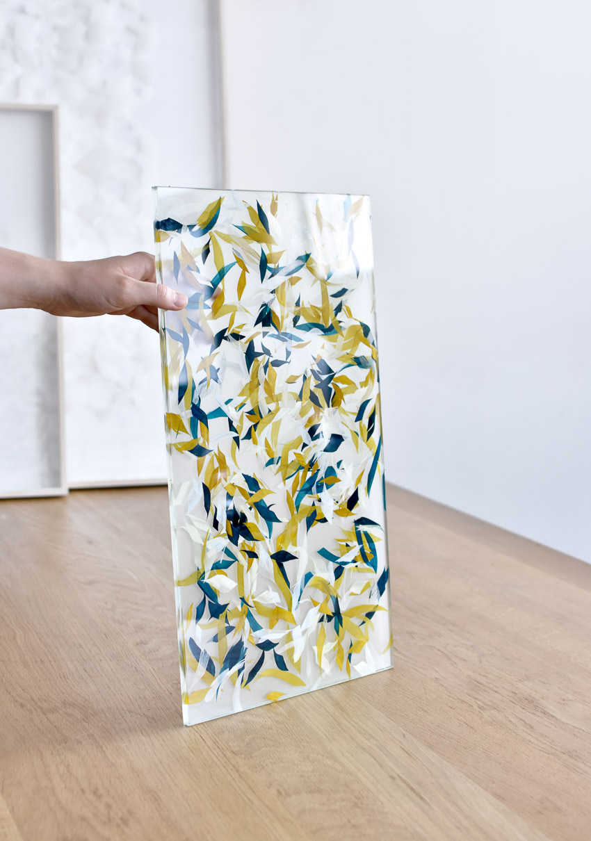 shown in yellow, turquoise & white goose feather fragments, inset into transparent glass – bespoke finishes & sizes available