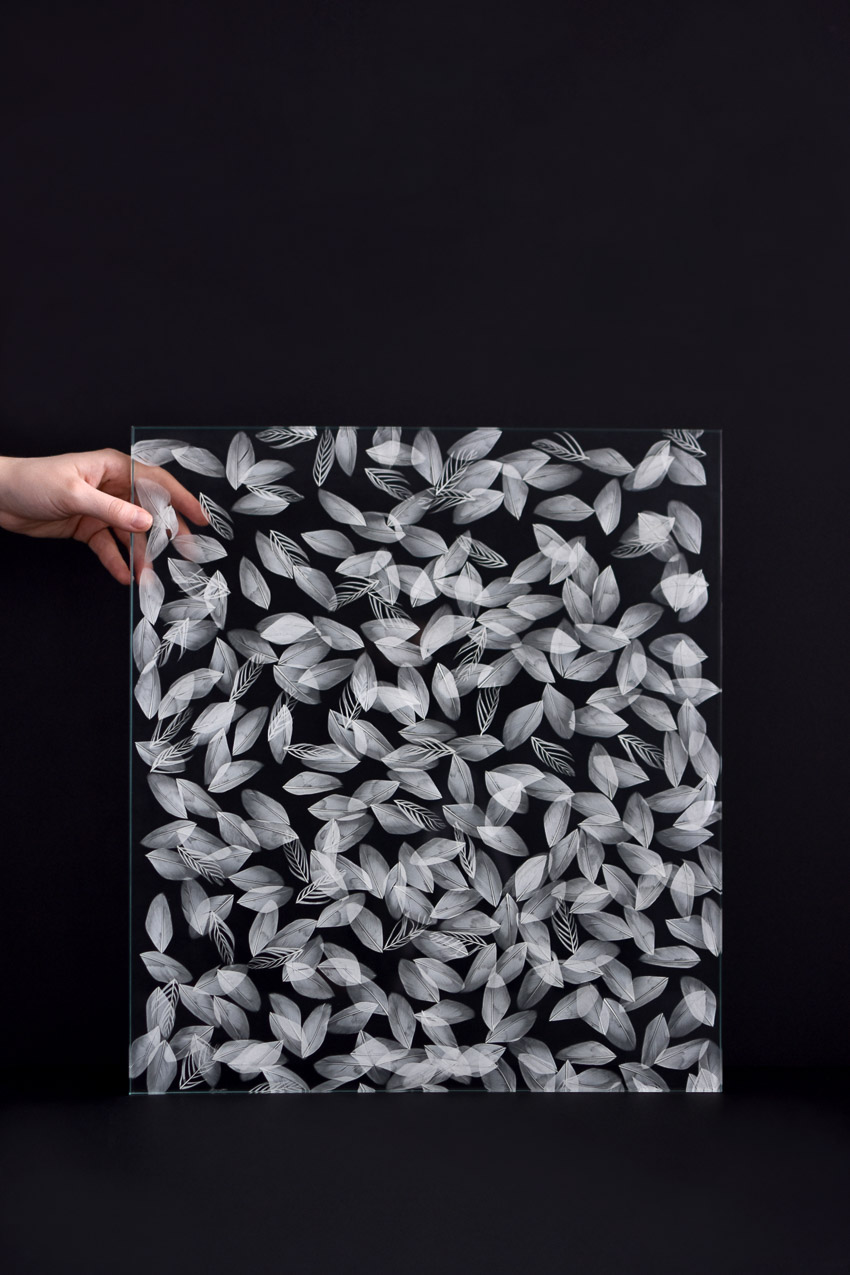 shown in hand cut white goose feathers, inset into transparent glass – bespoke finishes & sizes available