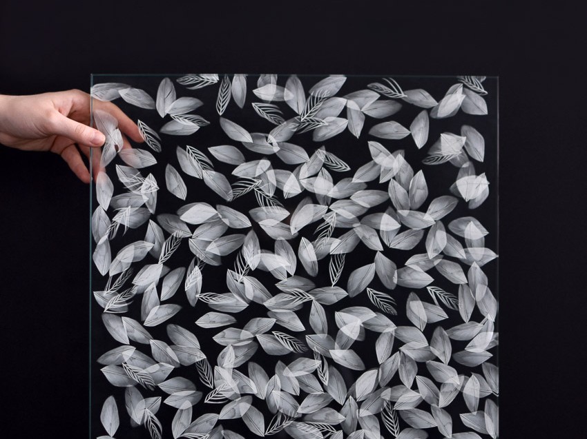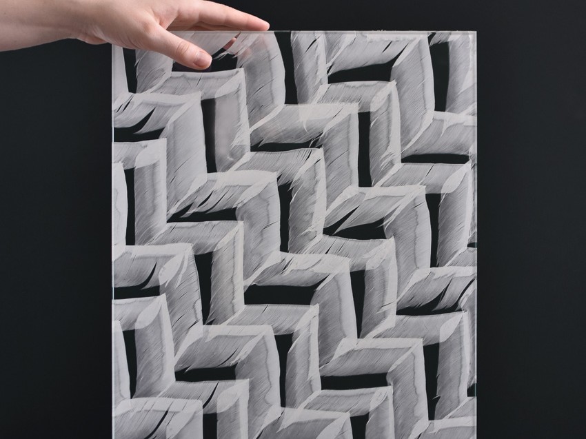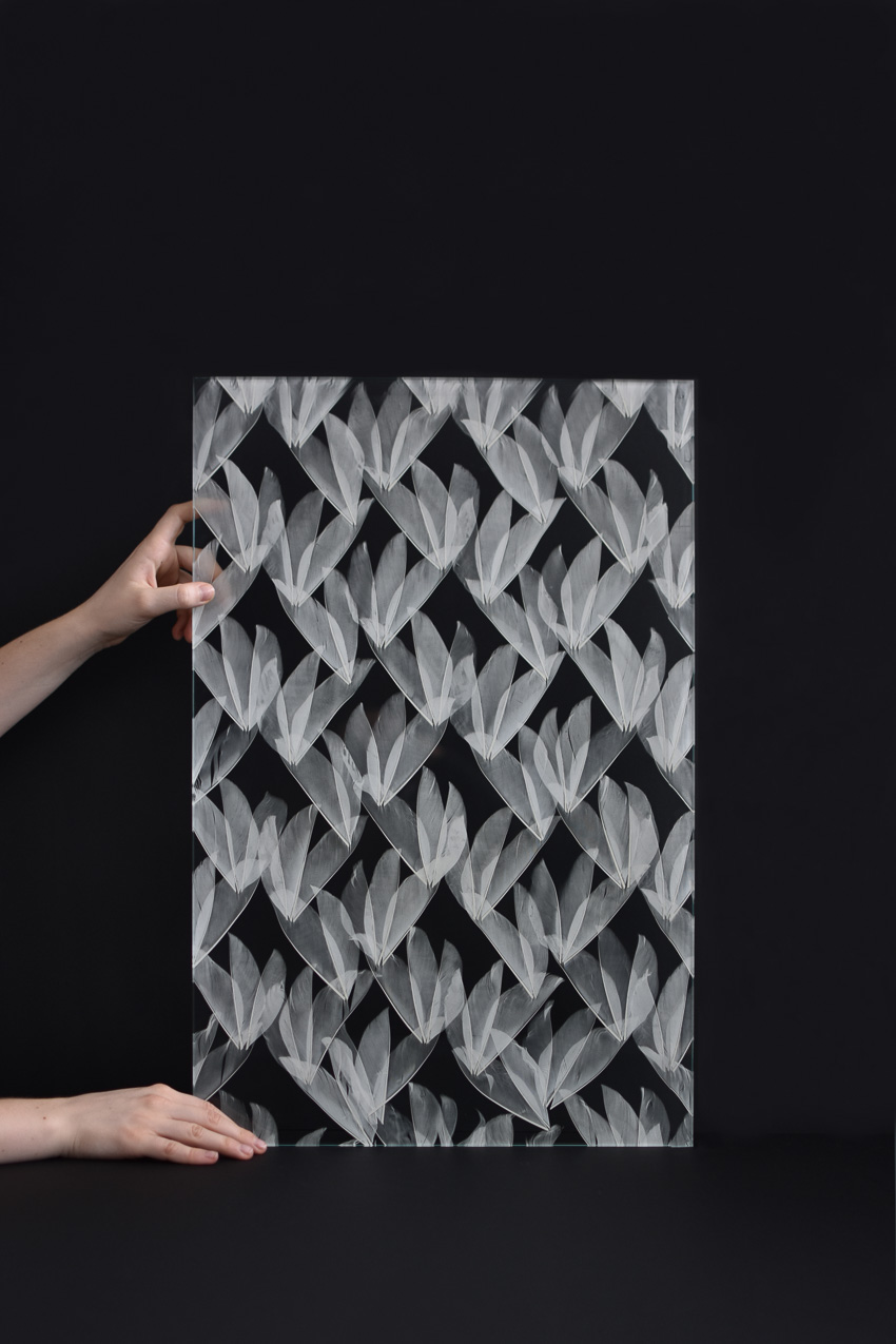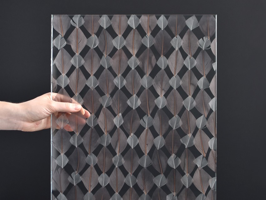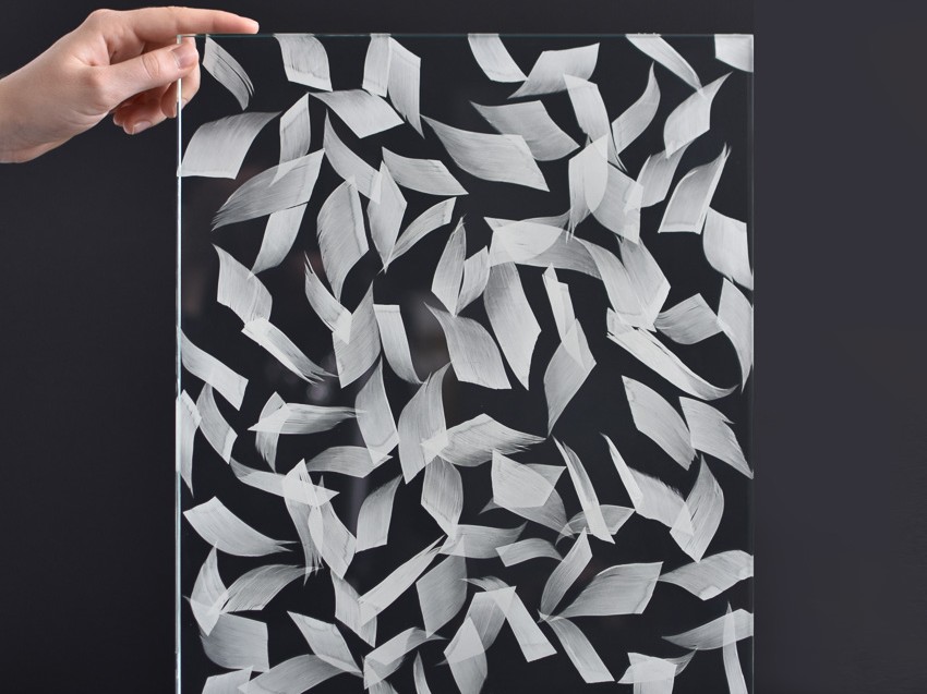 shown in geometric composition of white goose feathers, inset into transparent glass – bespoke finishes & sizes available