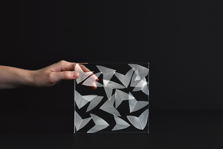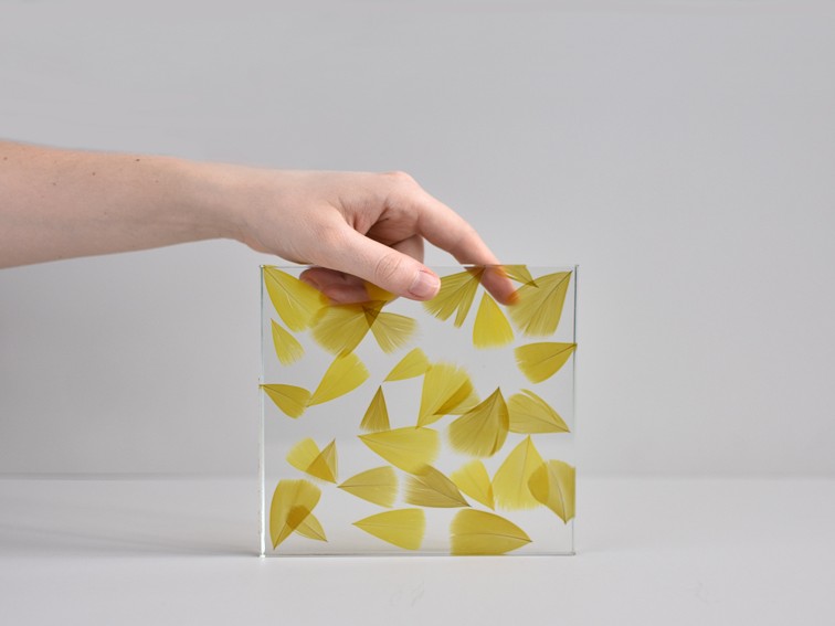 shown in hand cut white goose feathers, inset into transparent glass – bespoke finishes & sizes available