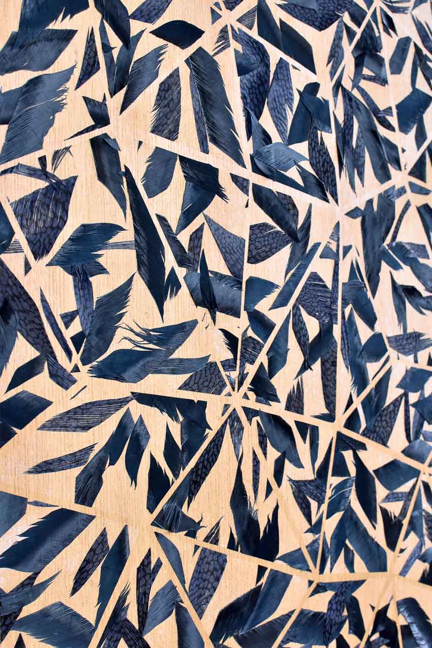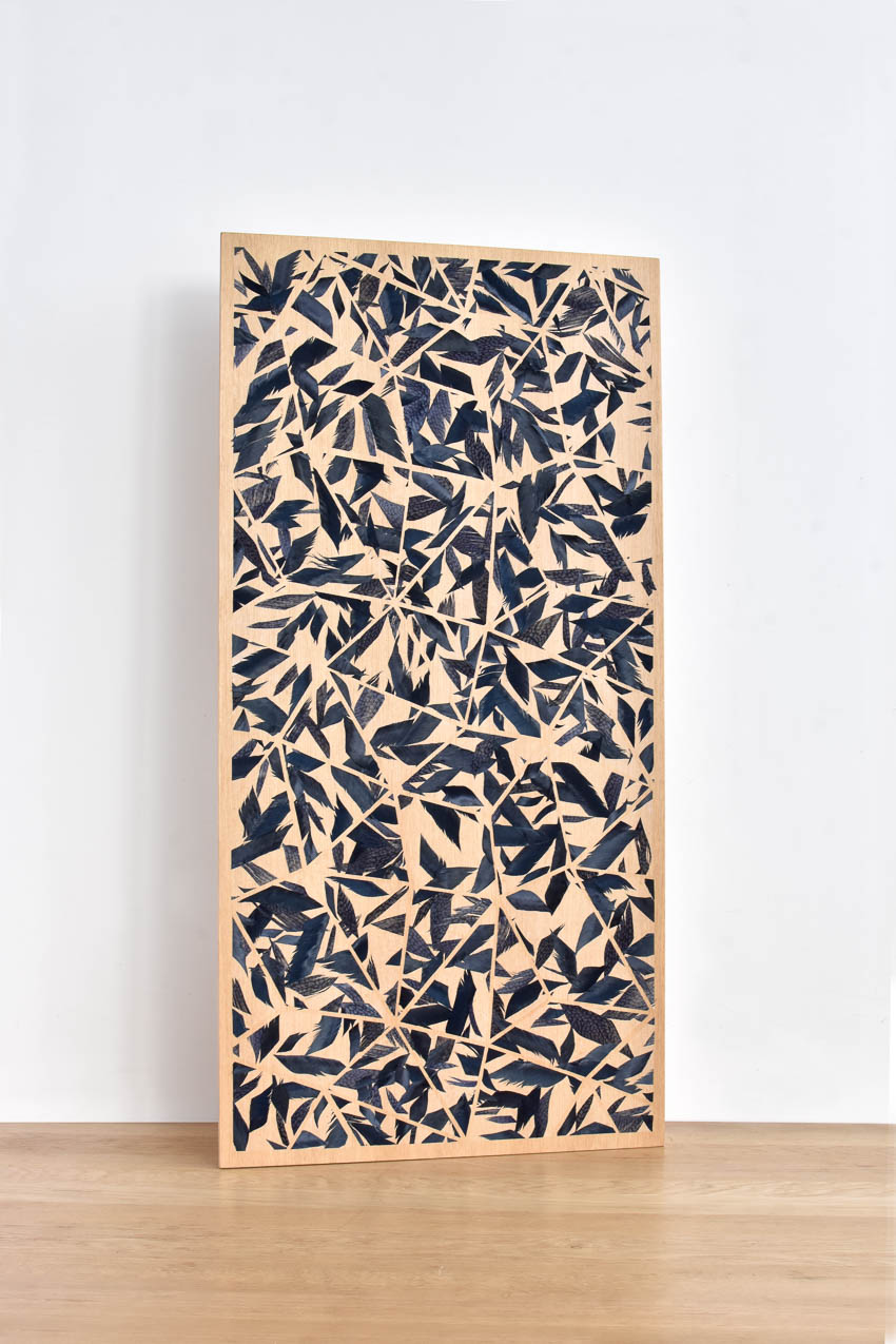 shown in rooster & turkey feather fragments, wooden panel – bespoke finishes & sizes available
