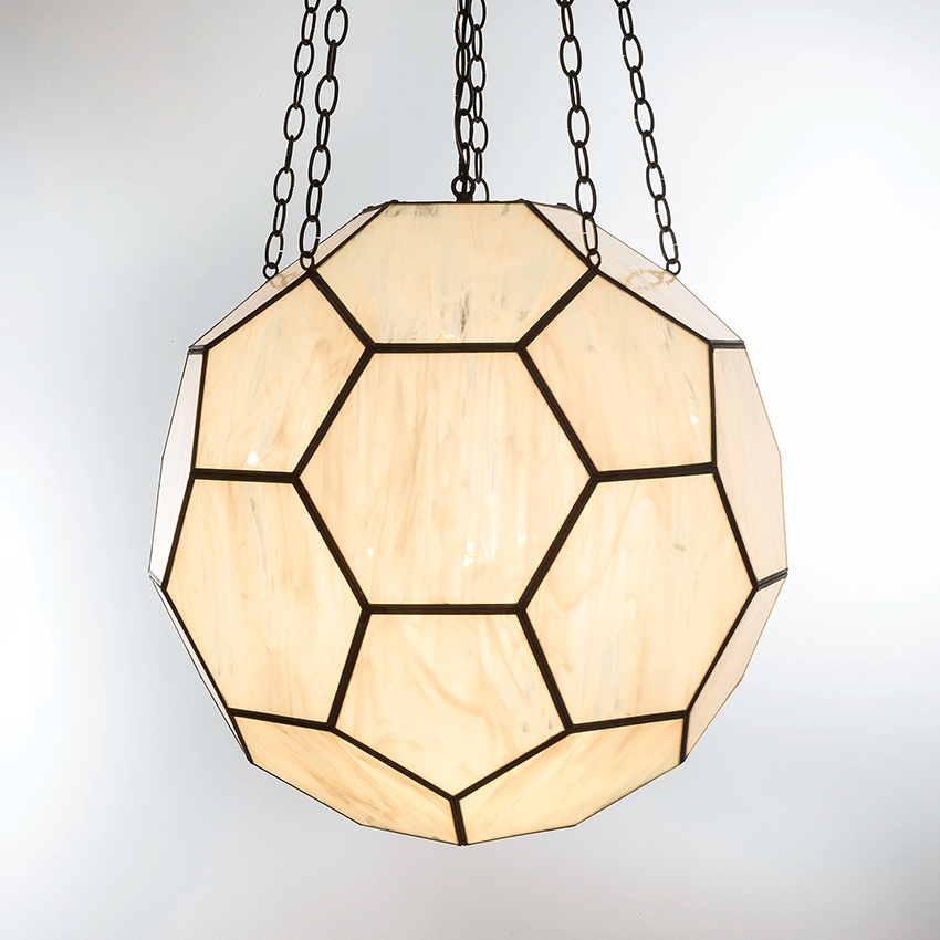 shown in white artisan glass with oil rubbed bronze chain & pentagon canopy, includes 3′ of chain – bespoke finishes & sizes available