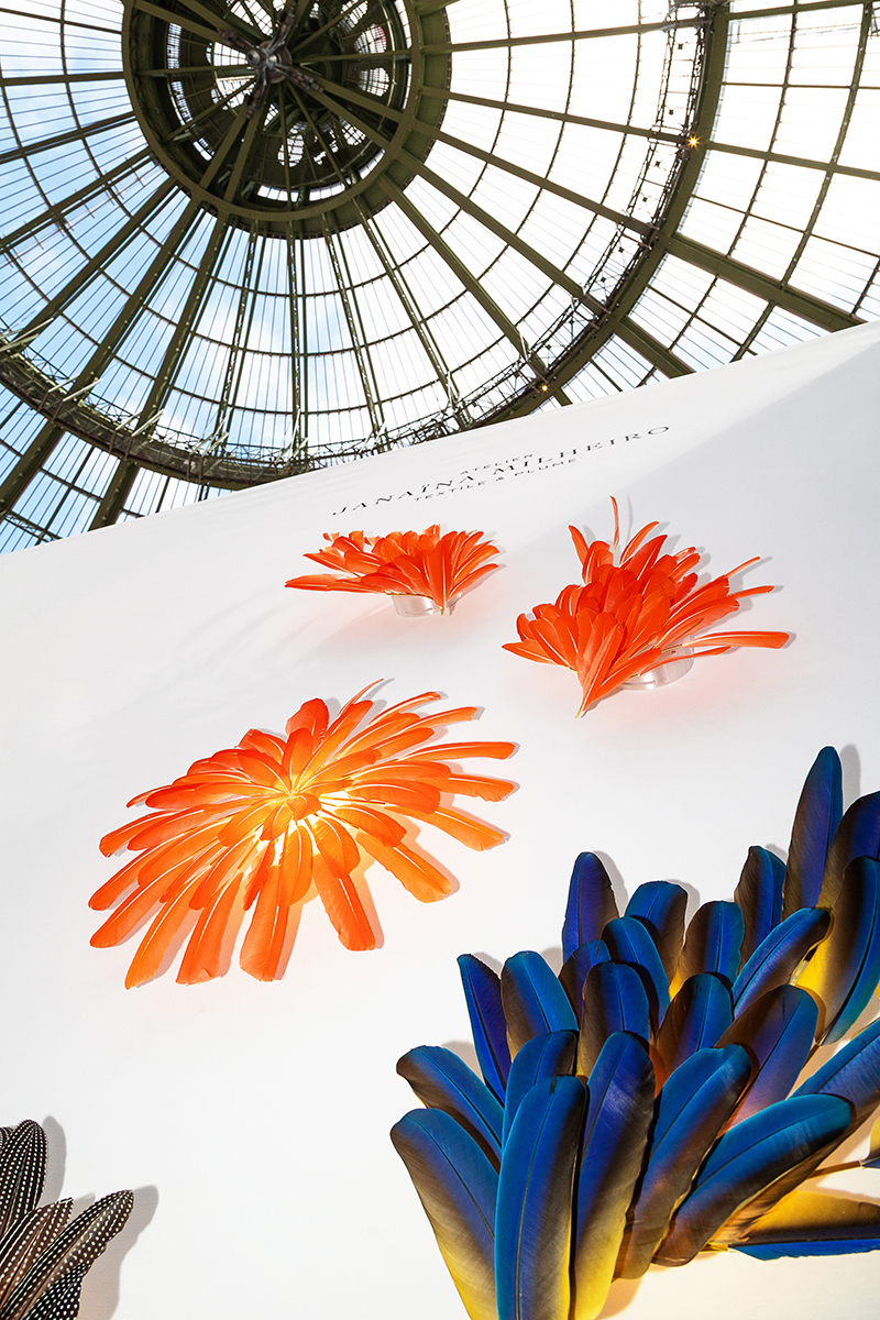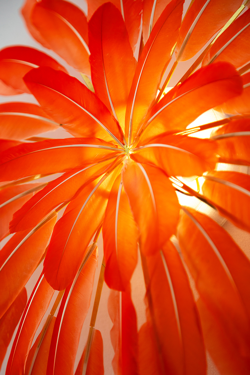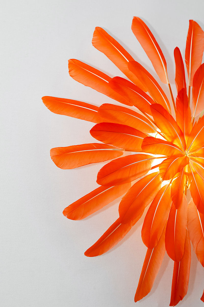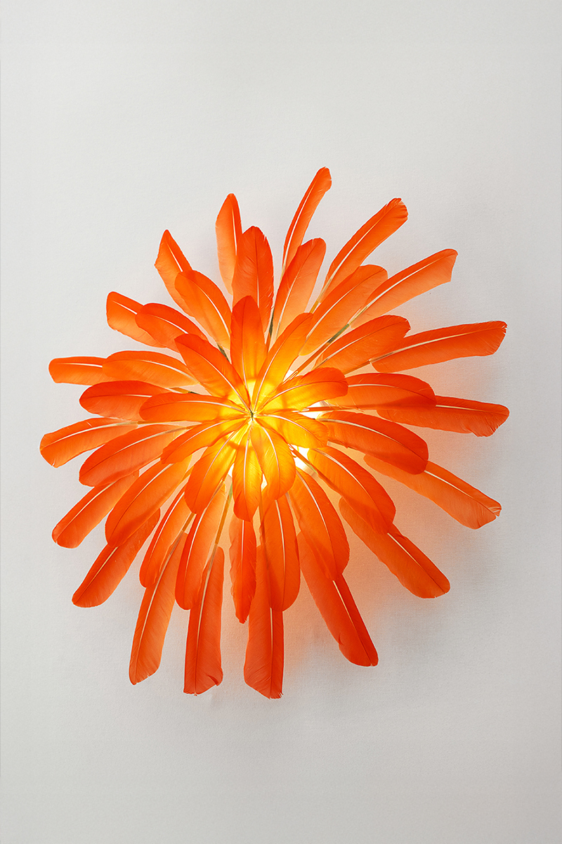 shown in ibis feathers, brass, LED module – bespoke finishes & sizes available