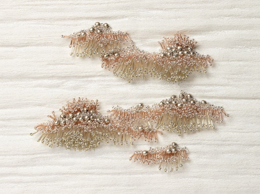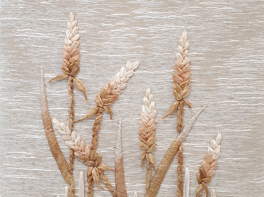 shown in raffia, wool, cotton, glass bugle beads, linen thread on fabric background – bespoke finishes & sizes available