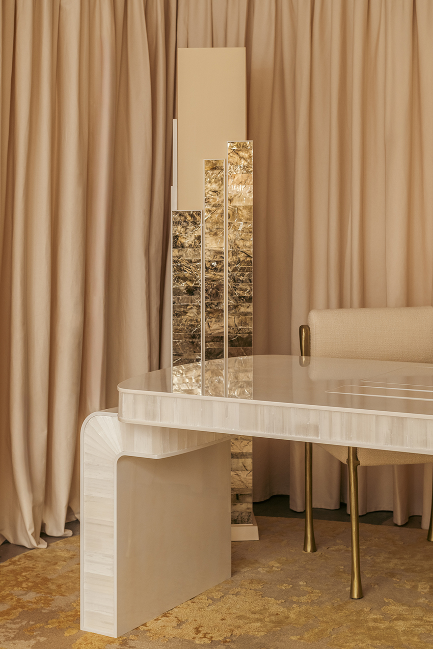 shown in straw marquetry, patinated brass – bespoke finishes & sizes available