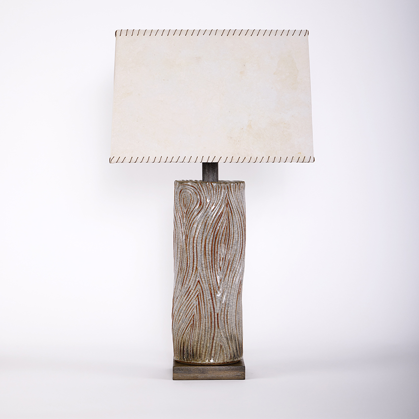 shown in white clay body with shino crackle glaze, grey oak base, custom handstitched bark paper shade with leather lacing – bespoke finishes & sizes available