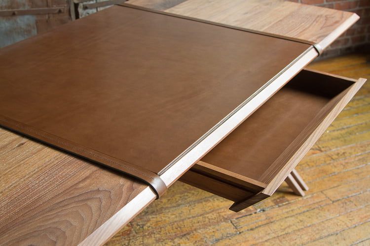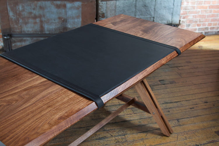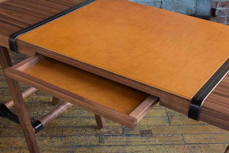 upholstery weight leather with suede underside, stitched over 1/8″ hard substrate, overall thickness 3/16″
