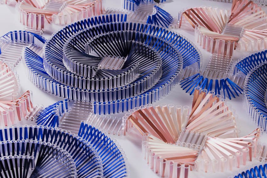 shown in acrylic tubes & satine ribbons on wood paneling – bespoke finishes & sizes available