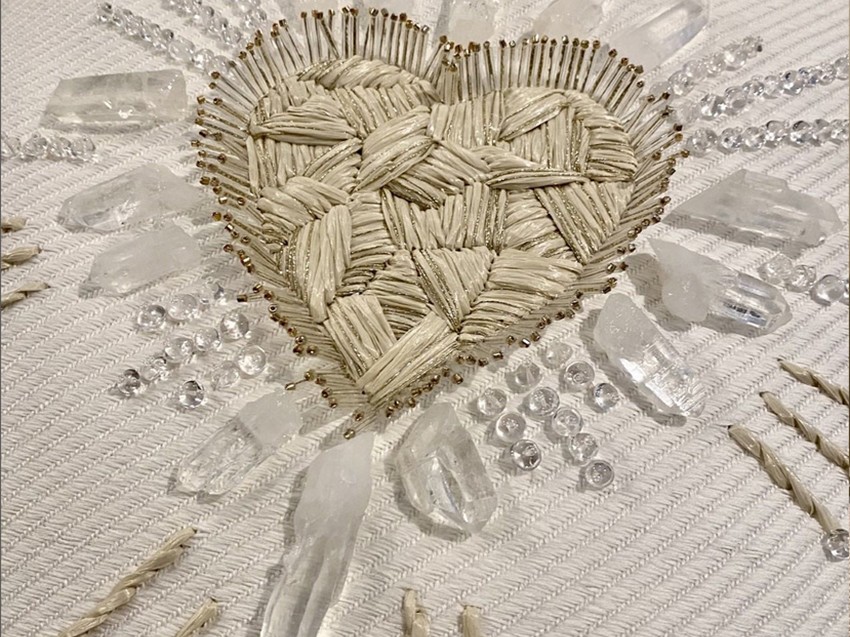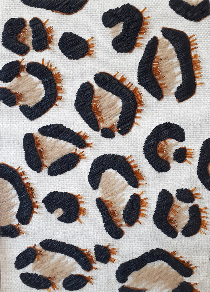 shown in raffia, wool, glass bugle beads on fabric background – bespoke finishes & sizes available