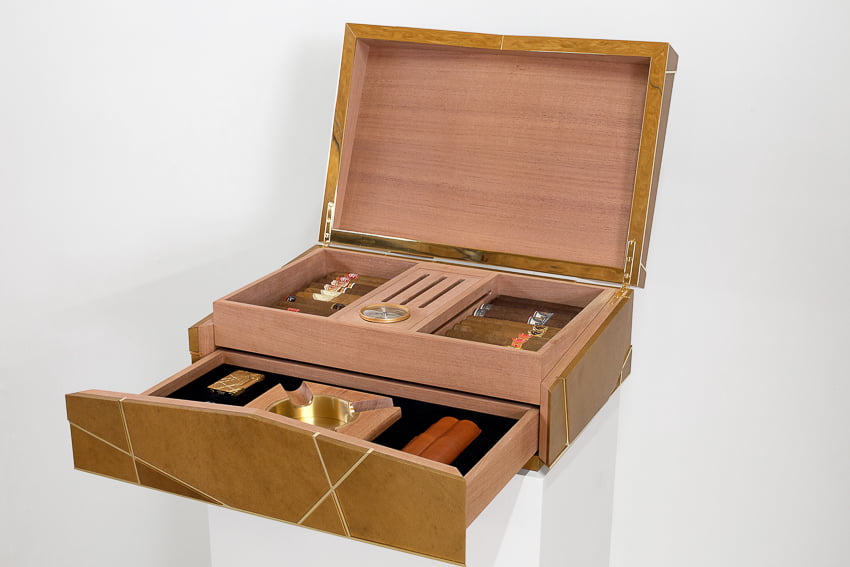 humidor opens at top with one secret drawer & includes ashtray, cigar cutter, S.T. Dupont lighter, cigar case