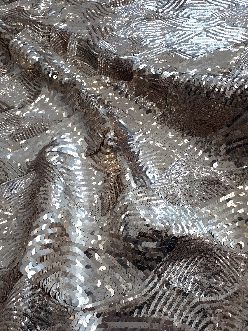 shown in silver plated brass sequins on fabric background – bespoke finishes & sizes available