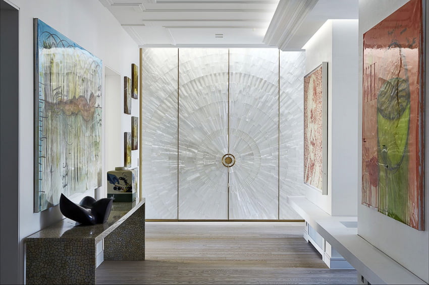 shown in sunburst pattern gypse, polished nickel detail, sycamore interior, white marble top – bespoke finishes & sizes available