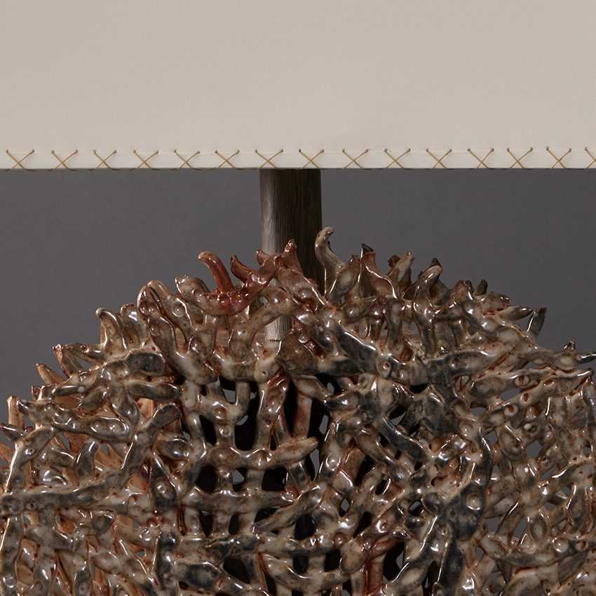 shown in white clay body with carbon trap shino glaze, grey stained oak base, custom handstitched pattern paper shade – bespoke finishes & sizes available