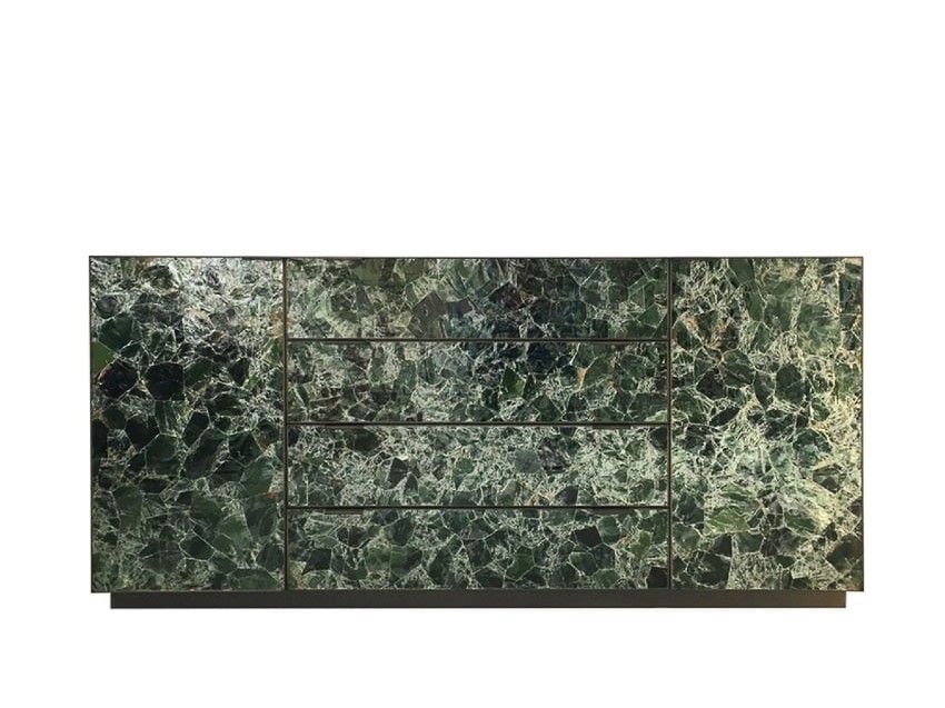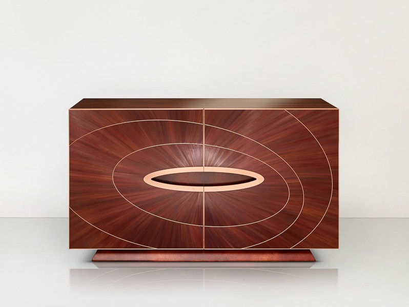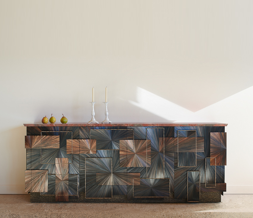 shown in straw marquetry, patinated brass, rouge marinace granite – bespoke finishes & sizes available