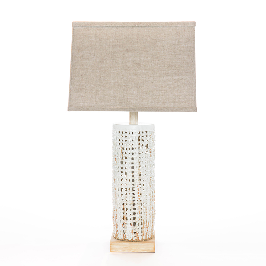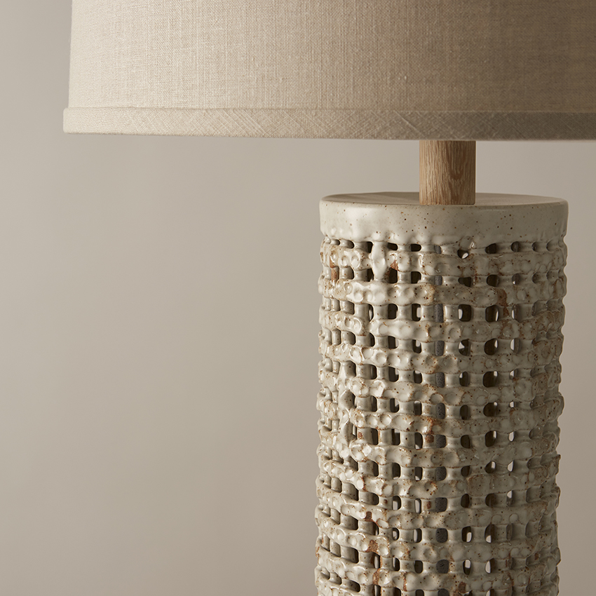 shown in white clay body with matte white glaze, bleached oak base, Sand linen shade – bespoke finishes & sizes available