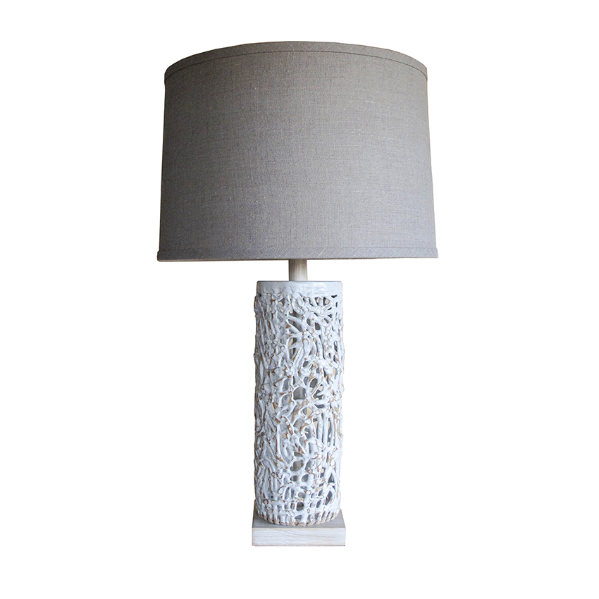 shown in white clay body with textured beach blue glaze, grey oak base, Sand linen shade – bespoke finishes & sizes available
