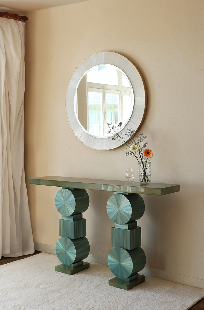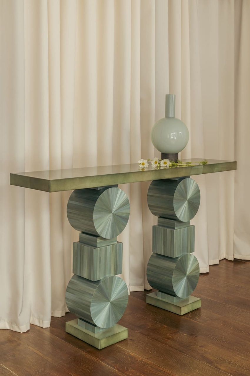 shown in straw marquetry, lacquer – bespoke finishes & sizes available